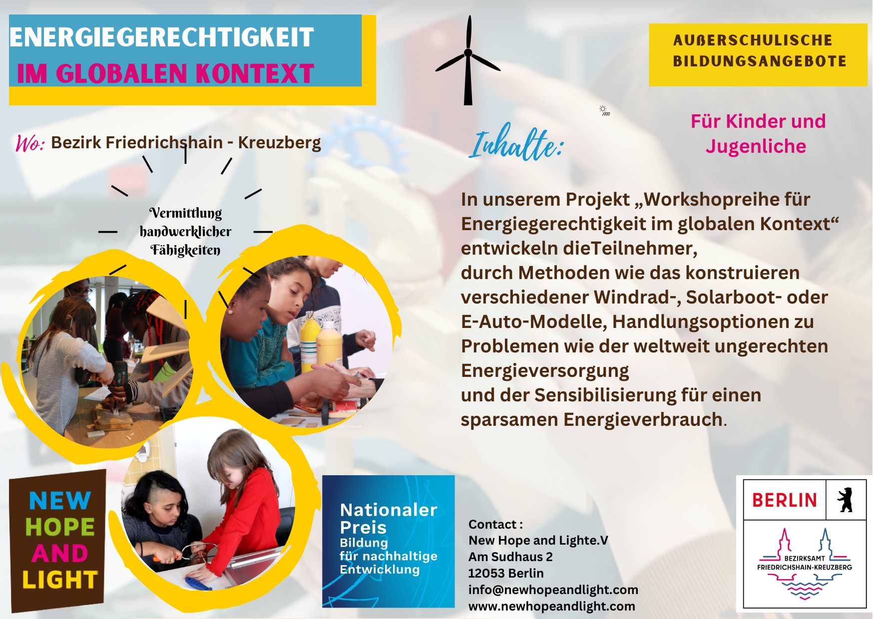 The project idea “Workshop series for Energy Justice in a Global Context” combines knowledge transfer for children and teenagers regarding the globally unjust energy supply with approaches to developing courses of action and constructing various models. It motivates students to engage with important topics such as climate change, renewable energy, ecological farming, waste reduction, and social justice.