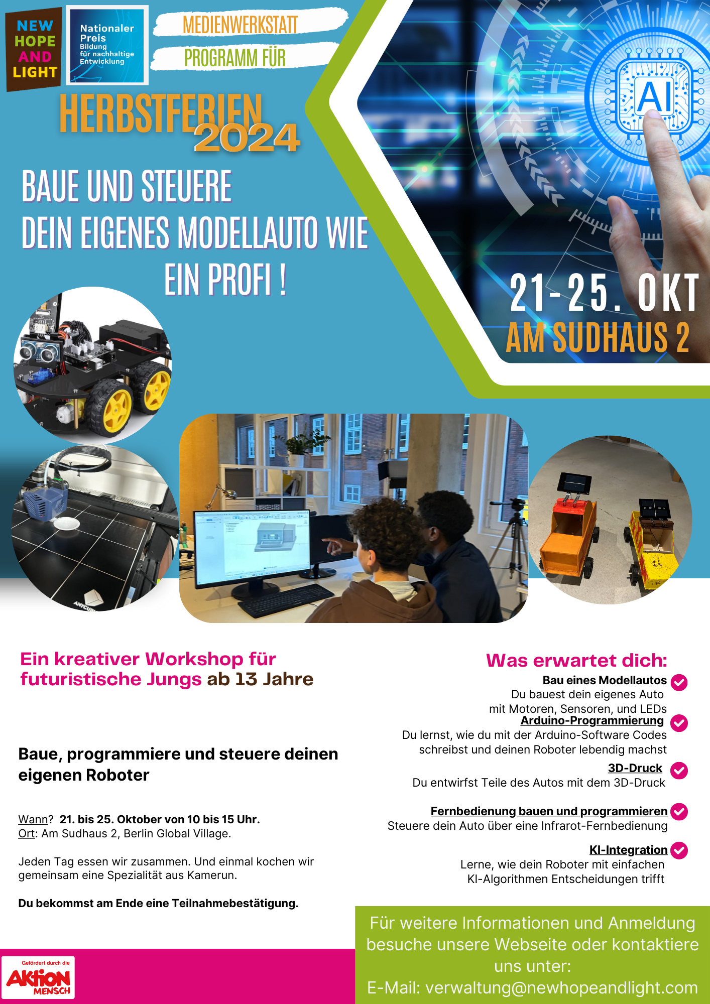 Vom 21. bis 25. Oktober 2024 bieten wir Jugendlichen ab 13 Jahren die einzigartige Chance, in die Welt der Automatisierung und Robotik einzutauchen! In unserer Medienwerkstatt Neukölln lernst du, wie du wie ein Profi dein eigenes Modellauto baust, programmierst und steuerst.